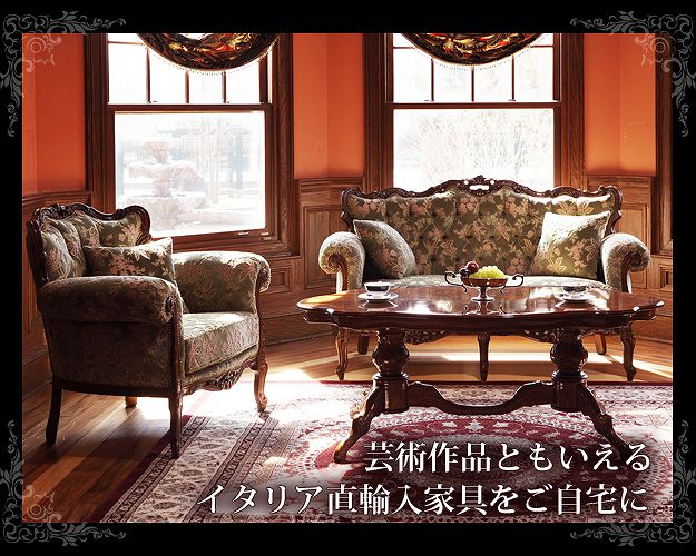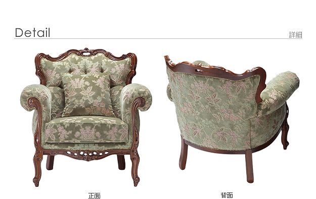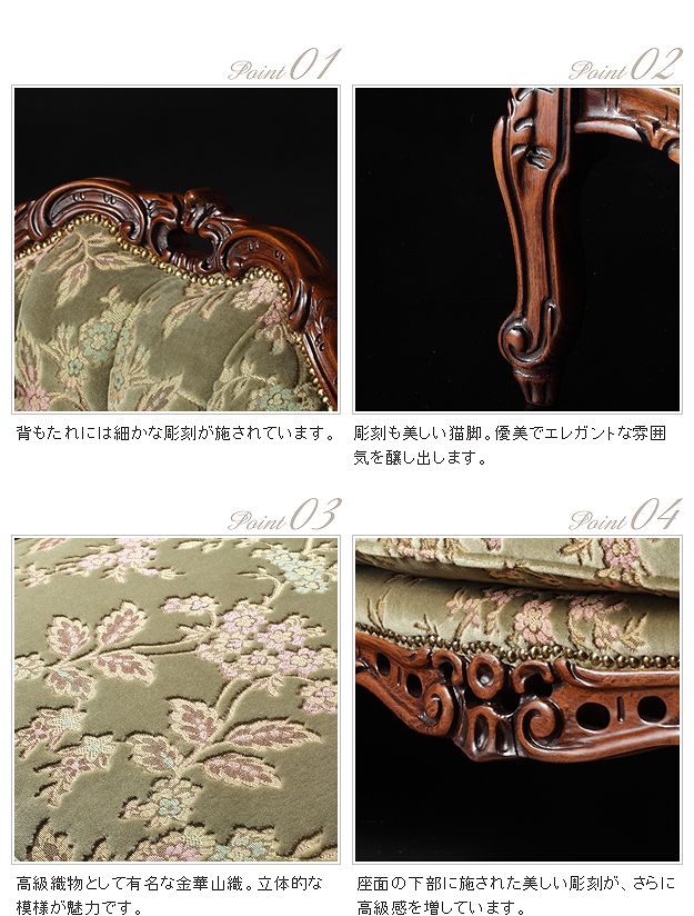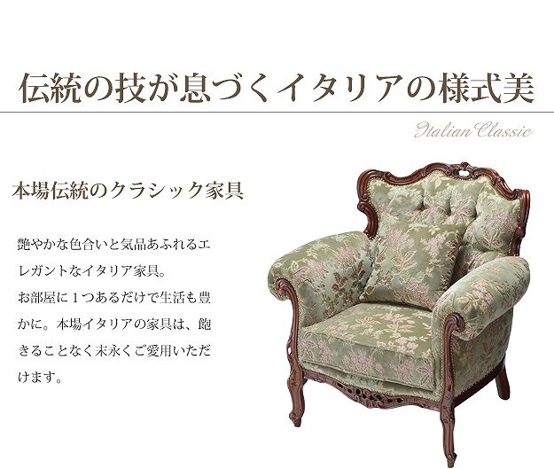 商品について:芸術作品ともいえるイタリア直輸入家具をご自宅に☆ヴェローナクラシック金華山ソファ(1人掛け)。立体感のあるしっとりとした質感の金華山織は華やかで高級感があります。フレームに施された彫刻と美しい猫脚も魅力的。滑らかな曲線を描くフォルムと豪華な金華山織がお部屋をエレガントに演出します。ミニクッション1個付き。