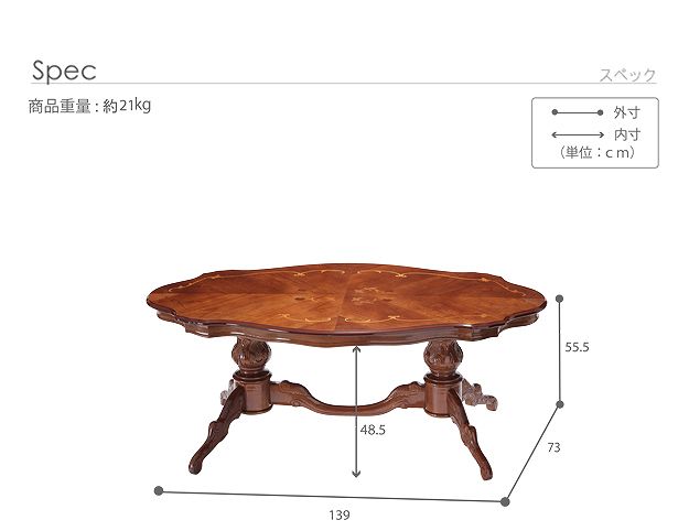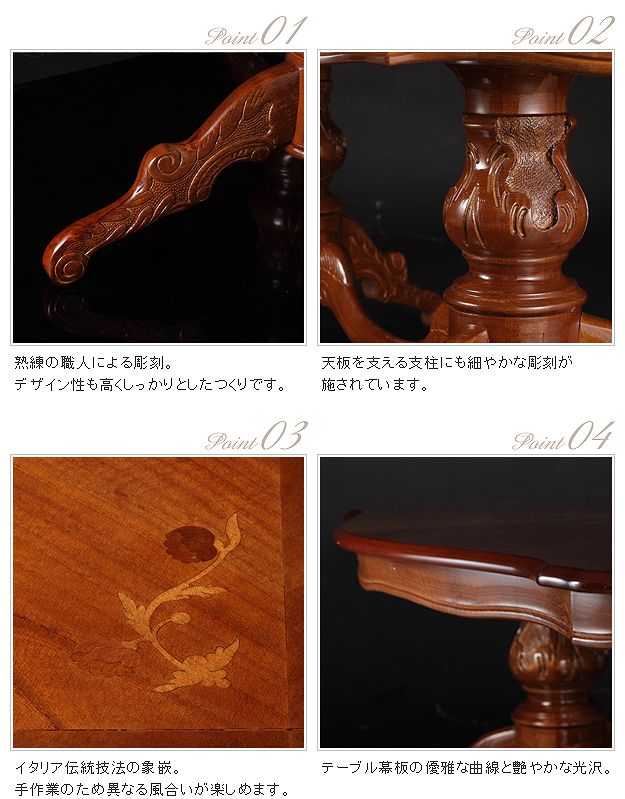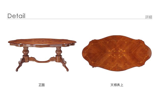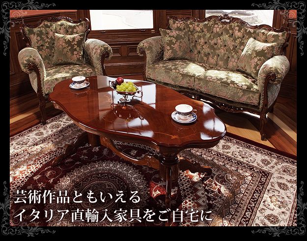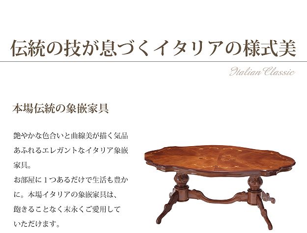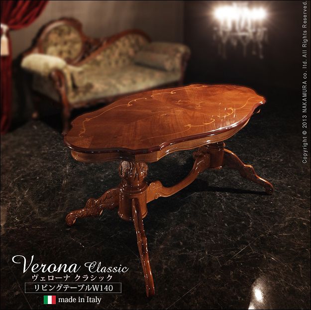 商品について:芸術作品ともいえるイタリア直輸入家具をご自宅に☆ヴェローナクラシックリビングテーブル。天板にはイタリア伝統の職人技である美しい象嵌細工が施されています。彫刻が美しい猫脚と滑らかな曲線を描くフォルムがお部屋をエレガントに演出します。