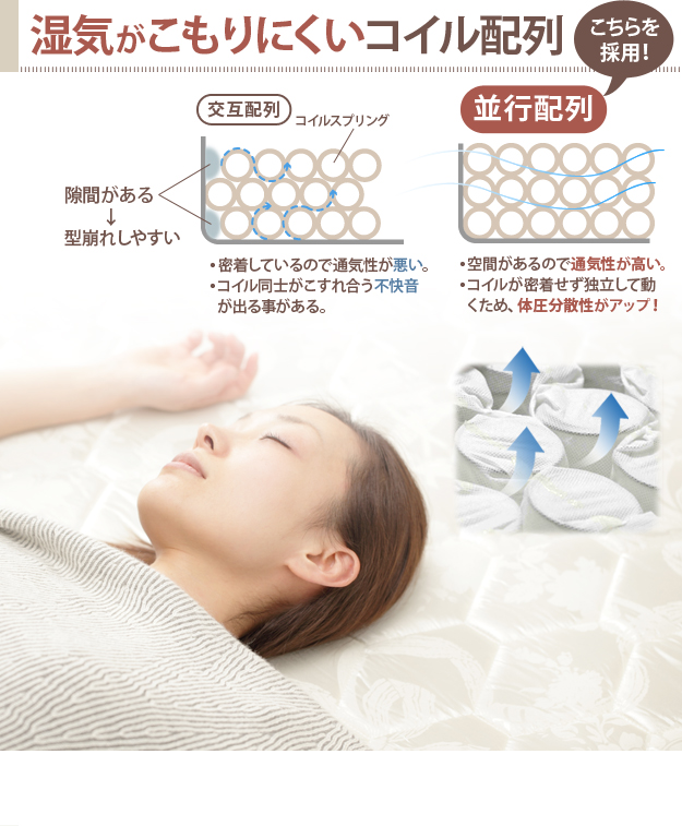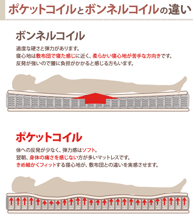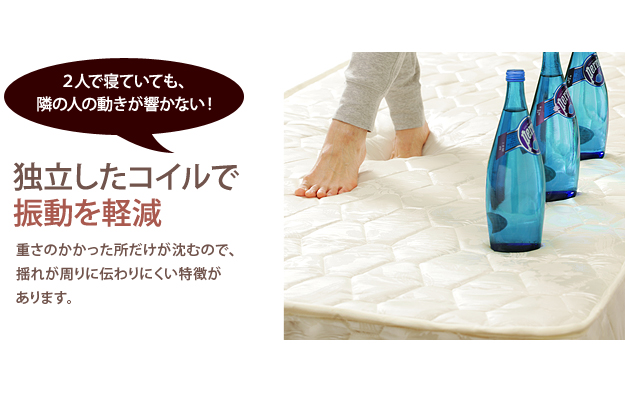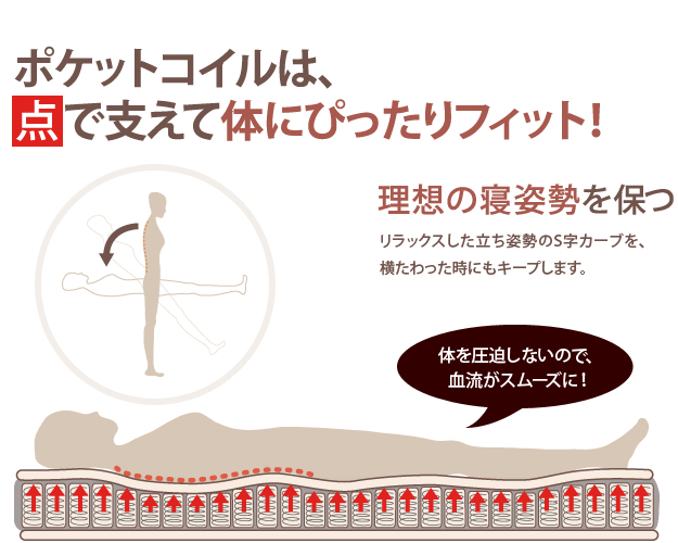 商品について:【ポケットコイルスプリングマットレス】独立した袋状のポケットにスプリングが1つ1つ入っている、体圧が分散され横揺れが少ないマットレスです。理想的な寝姿勢を保ち、ソフトな寝心地を好む方にお勧めです。
