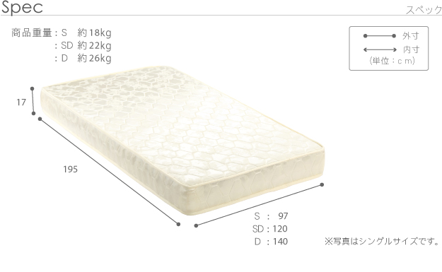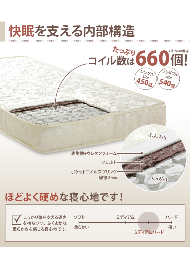 材質:側生地-ポリエステル100%、中身-ウレタンフォーム1cm、ポケットコイルスプリング高さ15cm・450個、不織布、フェルト