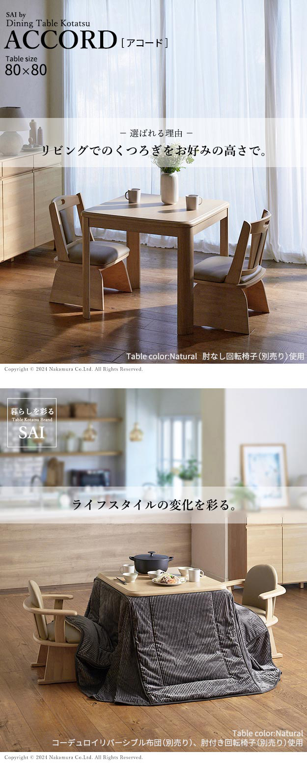 80×80cm 4点セット(こたつ本体+こたつ布団+肘付き回転椅子2脚)