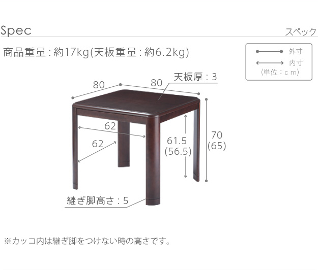 幅80x奥行80x高さ70/65cm(継脚5cm)・約17kg