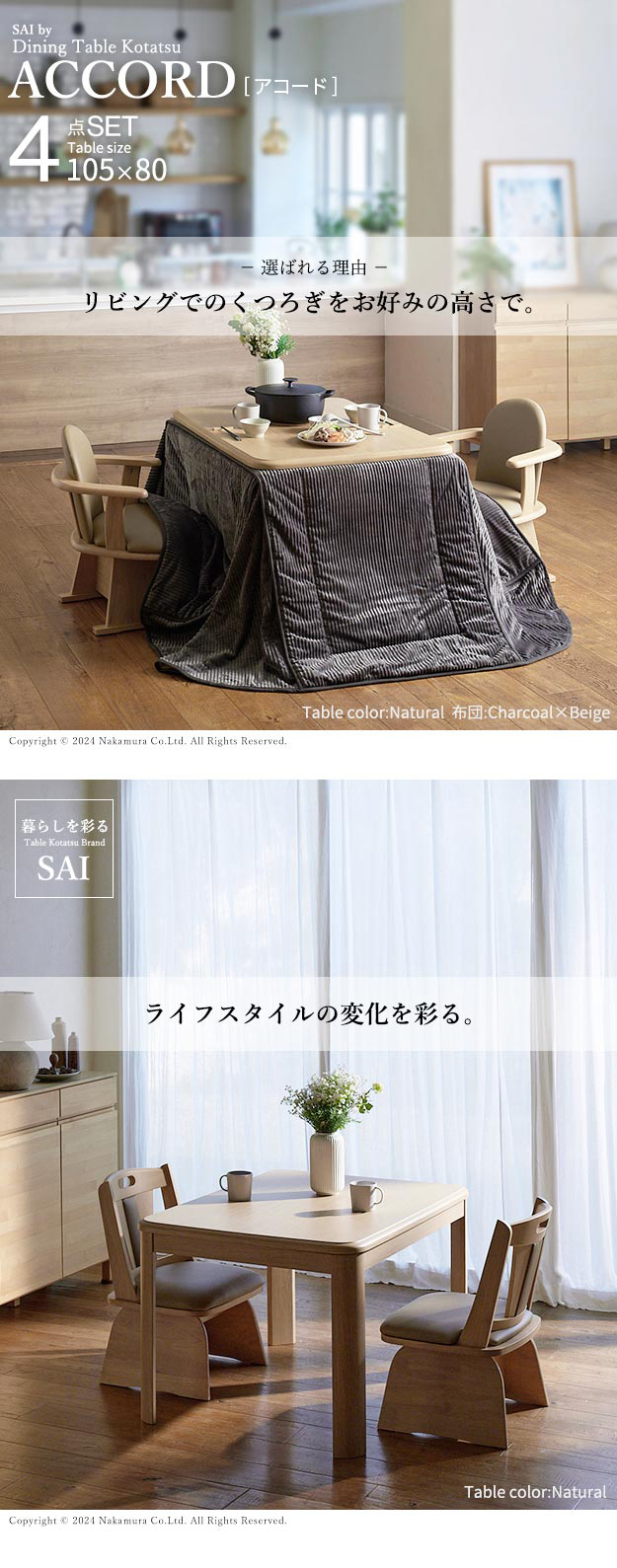 105×80cm 4点セット(こたつ本体+こたつ布団+肘付き回転椅子2脚)