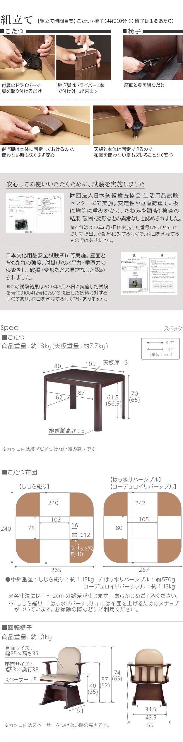 105×80cm 4点セット(こたつ本体+こたつ布団+回転椅子2脚)