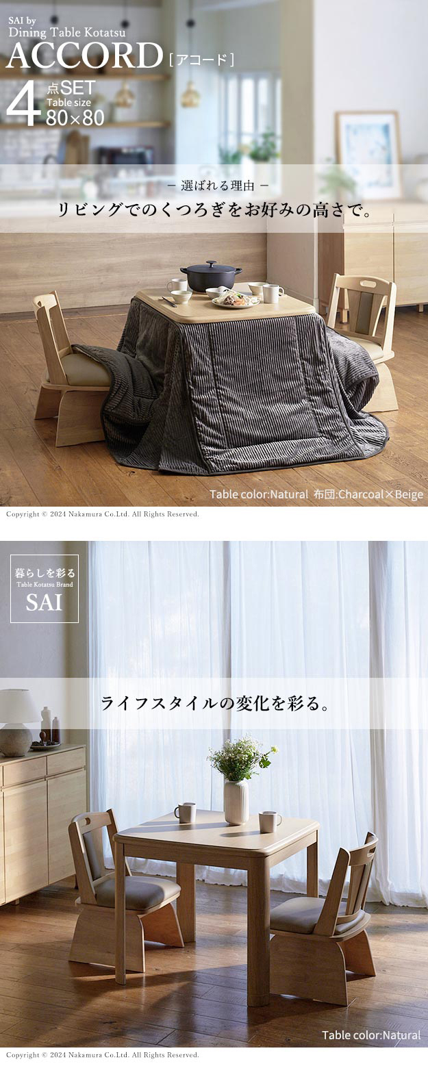 こたつ 正方形 ダイニングテーブル パワフルヒーター-高さ調節機能付きダイニングこたつ〔アコード〕 80x80cm 4点セット(こたつ本体+専用省スペース布団+回転椅子2脚)(代引不可)【送料無料】