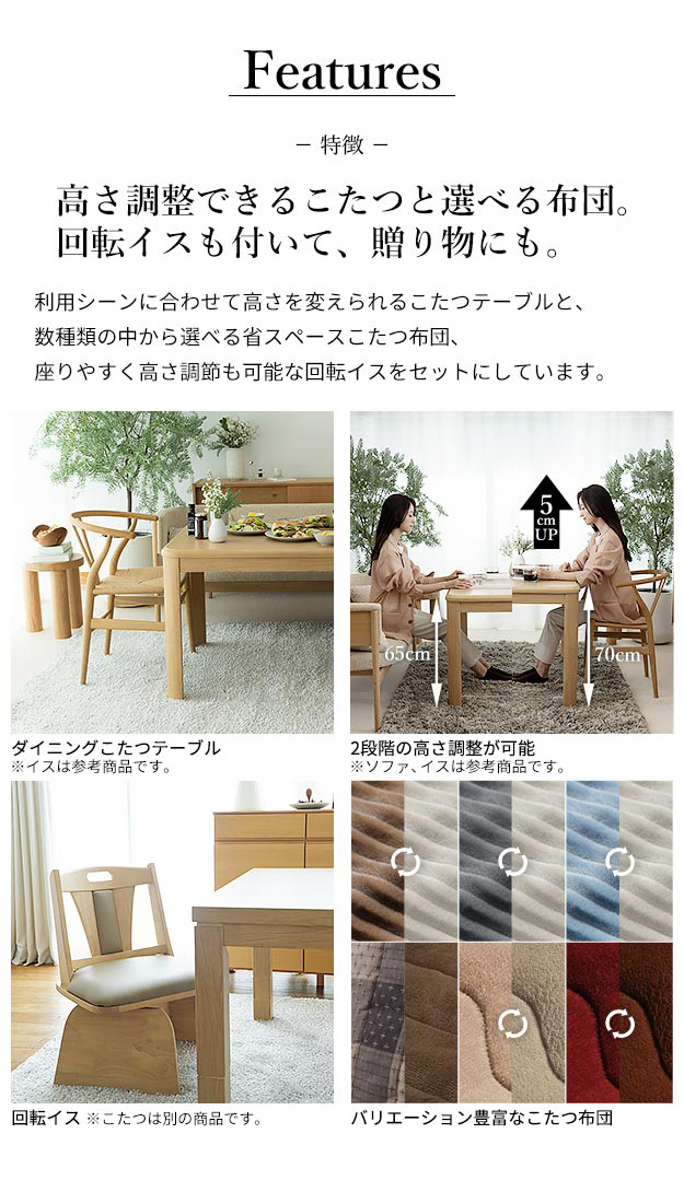 135×80cm 6点セット(こたつ本体+こたつ布団+肘付き回転椅子4脚)