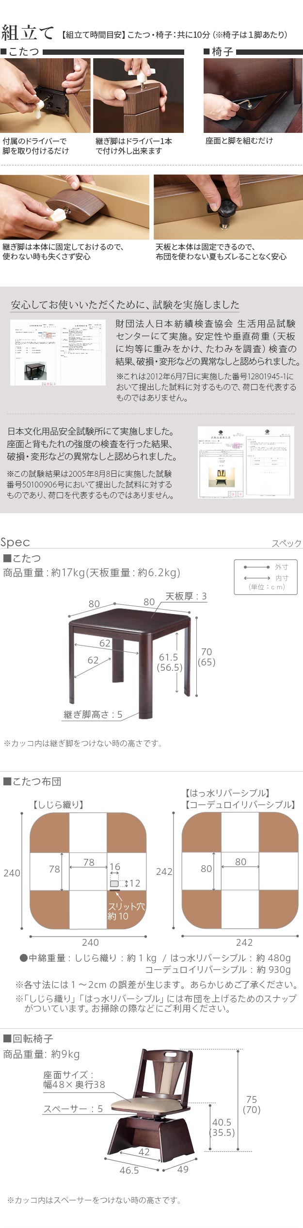 80×80cm 4点セット(こたつ本体+こたつ布団+回転椅子2脚)