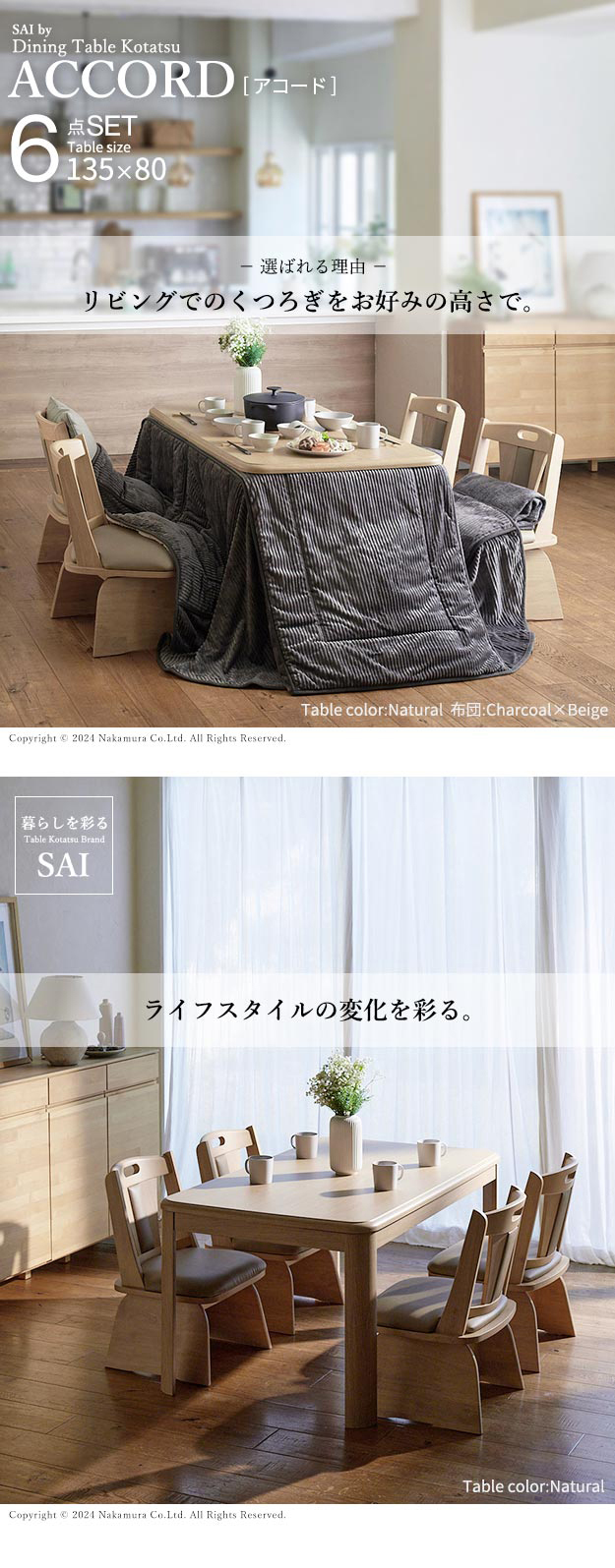 こたつ 長方形 ダイニングテーブル パワフルヒーター-高さ調節機能付きダイニングこたつ〔アコード〕 135x80cm 6点セット(こたつ本体+専用省スペース布団+回転椅子4脚)(代引不可)【送料無料】