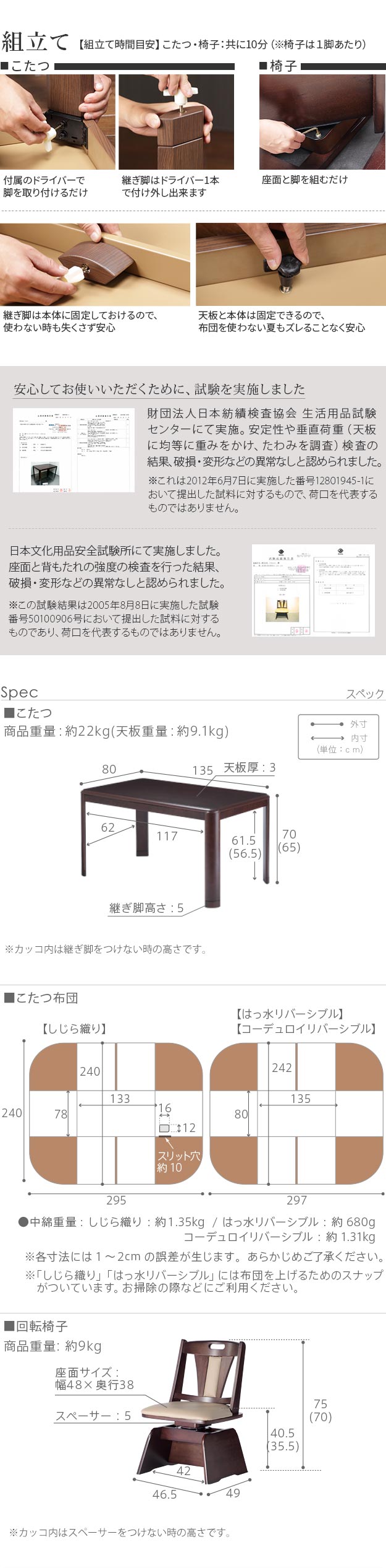 135×80cm 6点セット(こたつ本体+こたつ布団+回転椅子4脚)