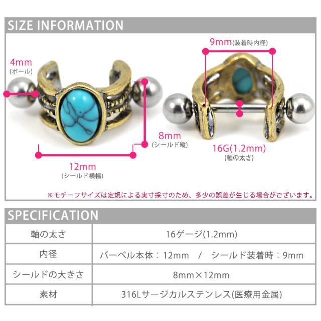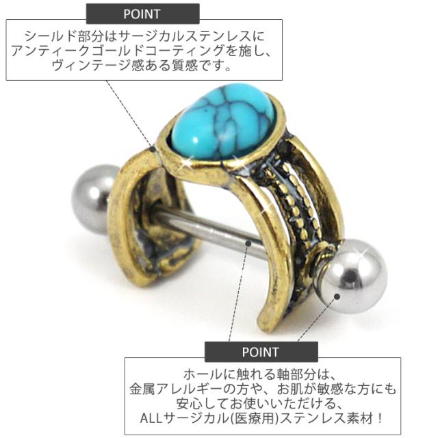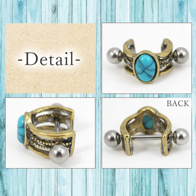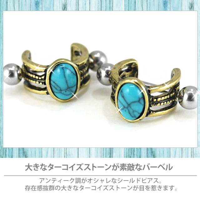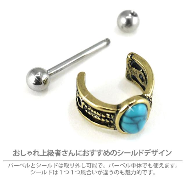 アンティーク調がオシャレなシールドと16Gのストレートバーベルがセットになった欲張りアイテム。前面には存在感抜群の大きなターコイズストーンが目を惹きます。1つ1つ風合いが違うのも魅力的です。耳たぶや耳の軟骨部分などをオシャレに飾ってくれますよ。セットでの装着はもちろん、ストレートバーベル単体でもご使用いただけます。バーベルは金属アレルギーにも安心安全の医療用ステンレス素材です。長時間使用することの多いボディピアスにぴったりな素材です。