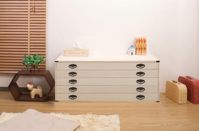 ■商品について/たとう紙を折らずに収納できる幅広の桐上置き用チェスト。桐材は内部を一定の湿度に保とうとする働きがあります。大切な衣類の保管に最適です。家具で有名な九州・大川で生産しており高品質です。引出の底板にも桐材に両面桐の綺麗な突き板を張っていますので、ここもアピールポイントです。
