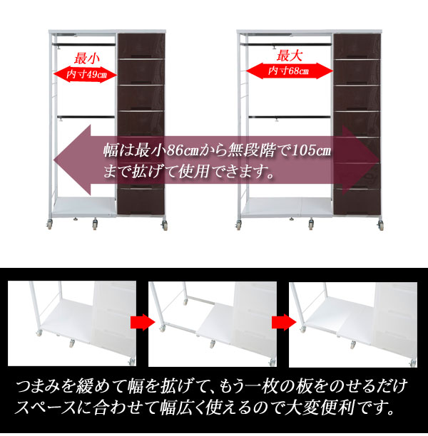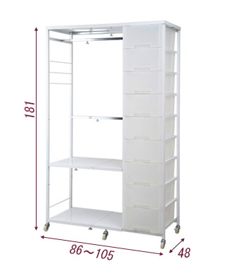 ●商品サイズ/本体:(約)幅86〜105×奥行48×高さ144cm、ハンガー下高さ:(約)122cm、ハンガー幅:(約)49〜68cm、引出し内寸:(約)幅28×奥行43×高さ17.5cm●耐荷重量/天板・棚板・ハンガー:約5kg