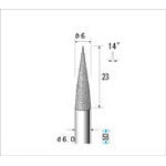 ●刃径(mm):6●刃長(mm):23●軸径(mm):6●全長(mm):58●最高使用回転数(rpm):45000●粒度(#):120●砥粒:ダイヤモンド●形状:テーパー●先端角(°):14