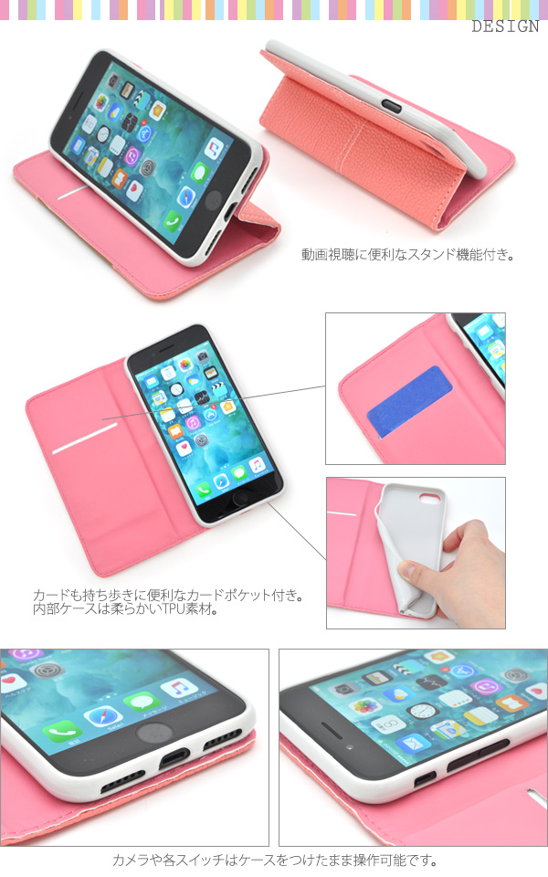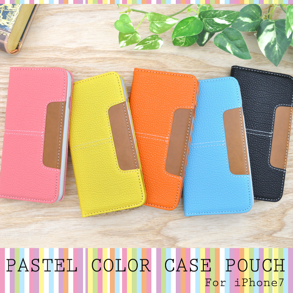 パステルカラーのiPhone用パステルカラーケースポーチ。 衝撃やキズ、埃などからiPhoneをしっかりと守ります。 内部ケースはソフトケースなので、着脱が簡単です。 背面を折り返すとスタンドとして使用できるので、動画視聴に便利です。カード収納に便利なカードポケット付き。カラーはピンク、オレンジ、イエロー、ブルー、ブラックの5色からお選びください。※iPhoneは付属しません。※ライセンス商品ではありません。 ※ケースをつけたまま撮影できますが、フラッシュ撮影時にケースの色が移り込むことがあります。