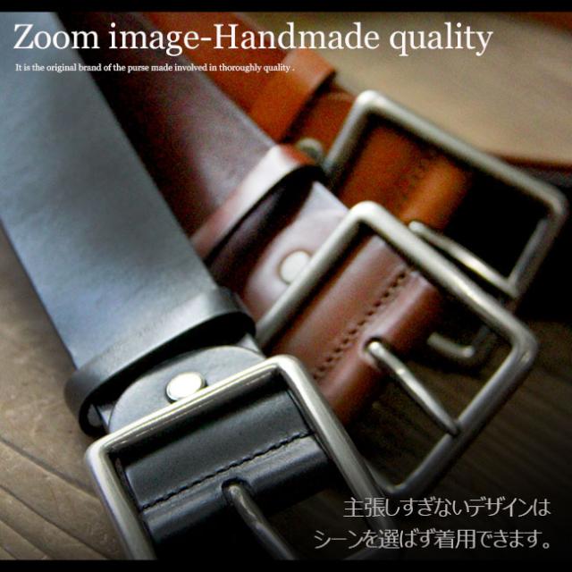幅4cmを超える極太のシルエットがデニムにぴったりな本革レザーベルトです。すっきりとしたスクエアのバックルと幅のあるベルトがよく合います。