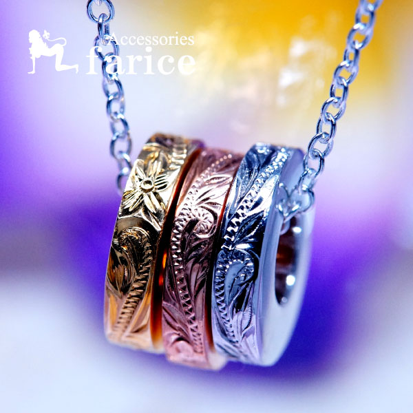 プルメリア&スクロール(花と波)彫り トリニティカラー・セパレート3リング ハワイアンジュエリー シルバー925 ネックレス