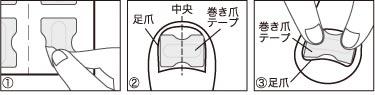 2.巻き爪テープの位置が爪の中央にくるように貼り付けてください。※巻き爪テープが爪の幅や長さよりも大きい場合は、巻き爪テープの両端をハサミで切って爪のサイズに合うように調節してください。