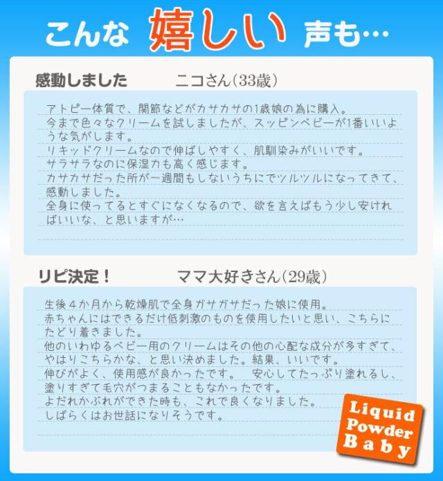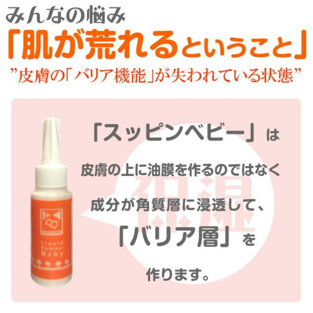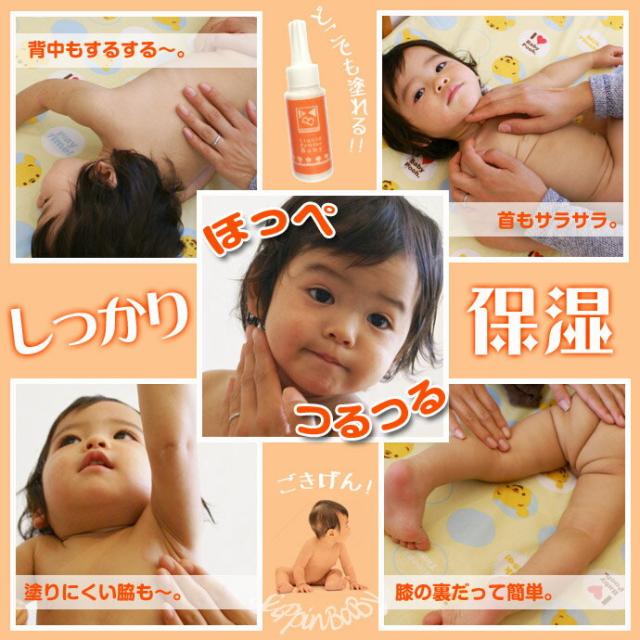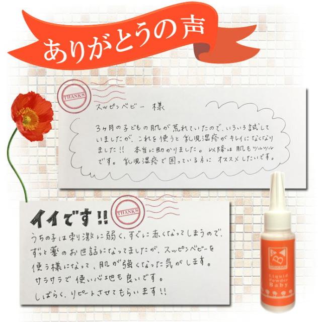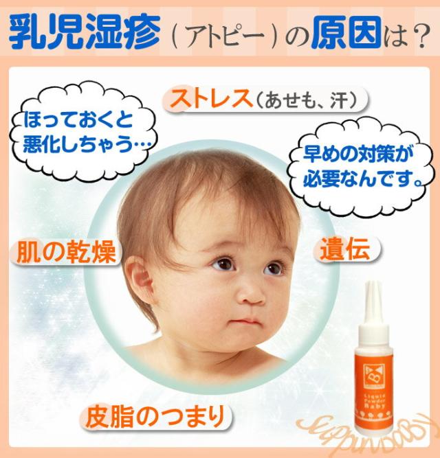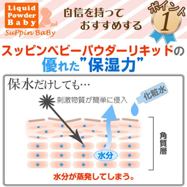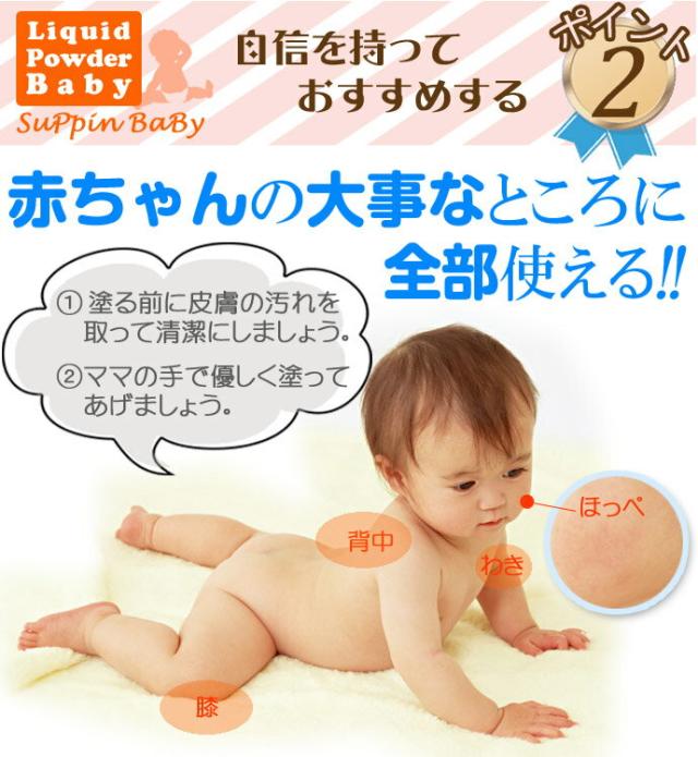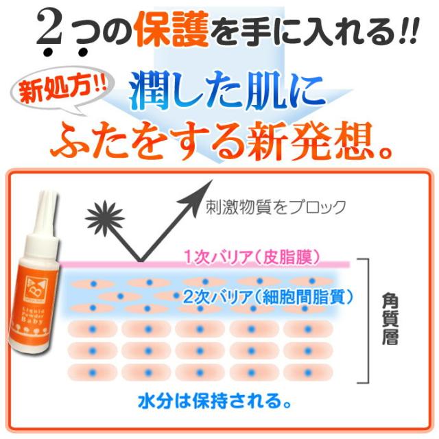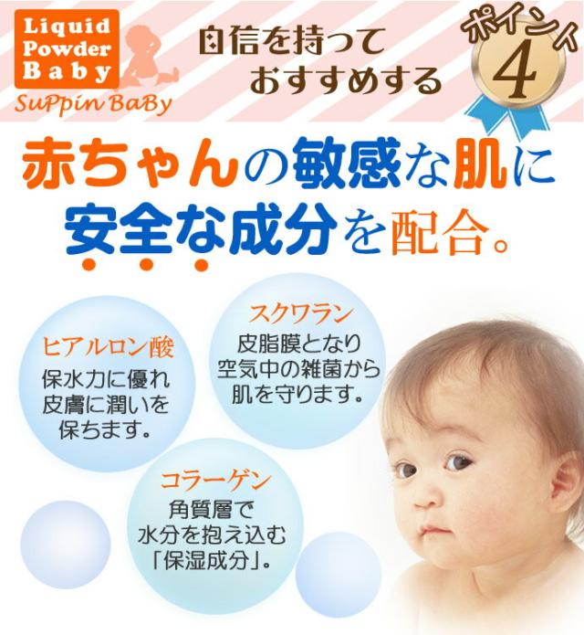 3、コラーゲンをはじめとした赤ちゃんにも安心な実績ある美容成分を配合 ●ご使用方法 2重構造になっていますのでキャップ上部のみあけて、適量をとり分けてください。 リキッドタイプなので、さらっとしていて粉飛びもなく床や衣服を汚しません。 顔や踵はもちろん、通常のベビーパウダーを使用したい箇所にむらなく塗布し、その後サラサラになるまで乾燥させてください。 ご使用後はキャップをしっかりと閉めて保管してください。