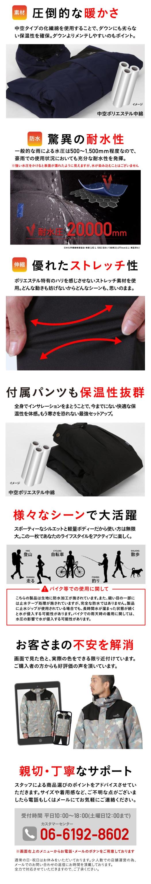ジャケット…ファスナーガード、フードストッパー、フードコントロール、フード脱着仕様、スタンドカラー仕様、止水ジップ、ダブルジップ、ハンドカフ、インナーカフ、スワローテイル仕様、ドローコード