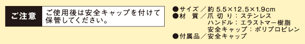 巻き爪や硬い爪のお手入れに! エラストマー素材により滑り止め効果を高めた握りやすいハンドル。 安全キャップ付き。 ■商品サイズ:約5.5×12.5×1.9cm ■材質:爪切り:ステンレス、ハンドル:エラストマー樹脂、安全キャップ:ポリプロピレン ■付属品:安全キャップ ■日本製 ■パッケージサイズ:155×25×75mm※使用感には個人差がございます。[omk]おまけはお一人様につき1点です。おまけの色などは選べません。