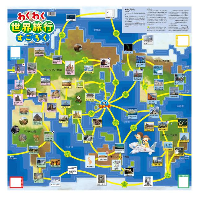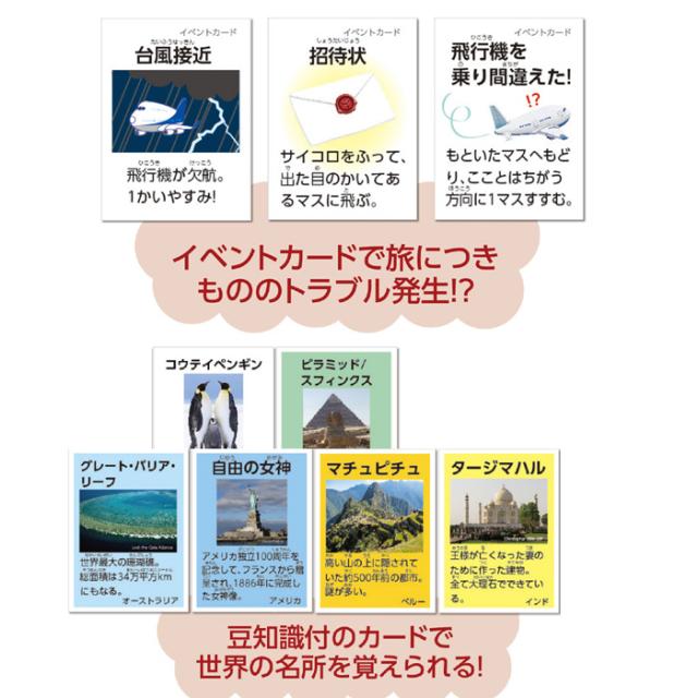 楽しいすごろく。すごろくで遊びながら世界一周にでかけよう!イベントカードで旅につきもののトラブルも!?豆知識つきのカードで世界の名所を覚えられる。