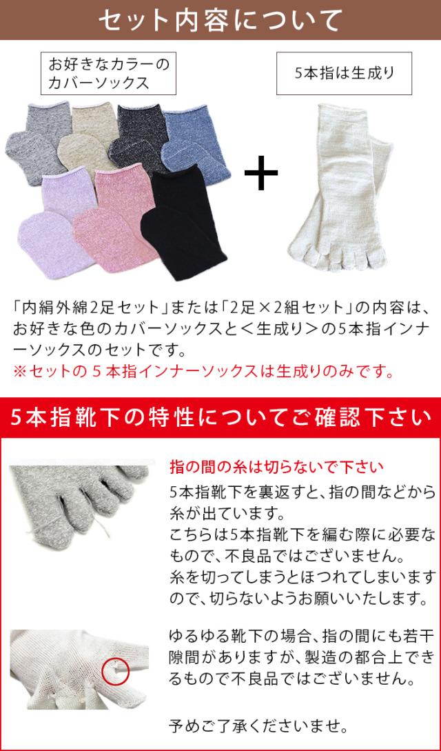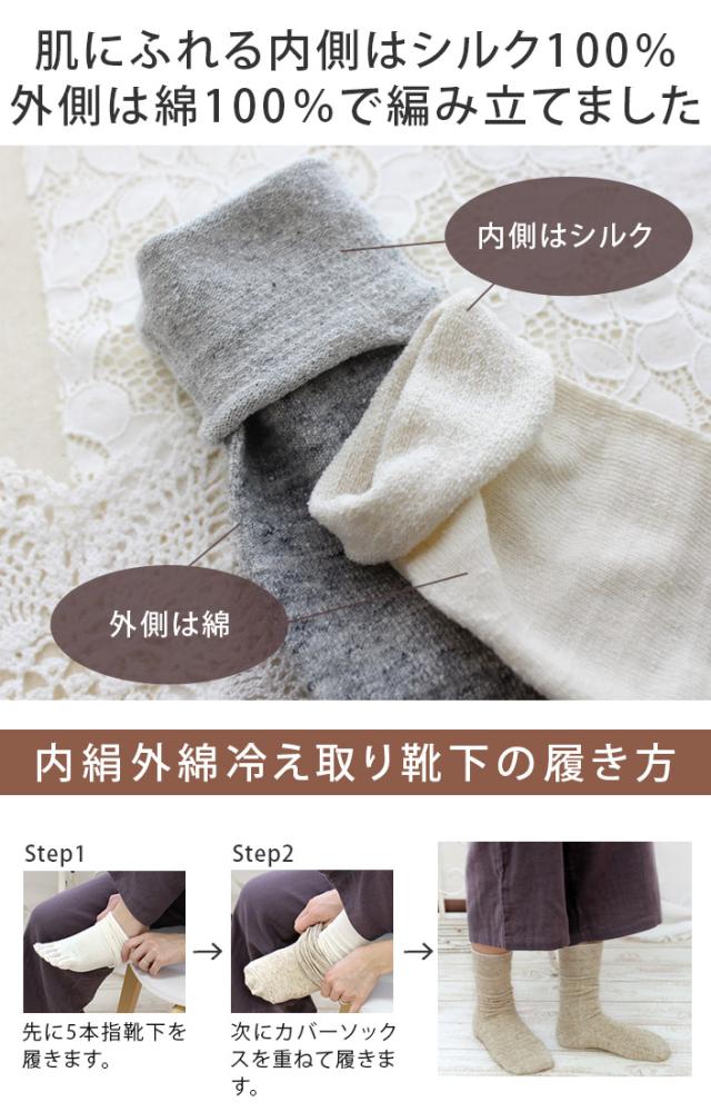 ■素材:内絹外綿 5本指インナーソックス、内絹外綿 先丸カバーソックスともに肌に当たる内側はシルク100%/外側は綿100%