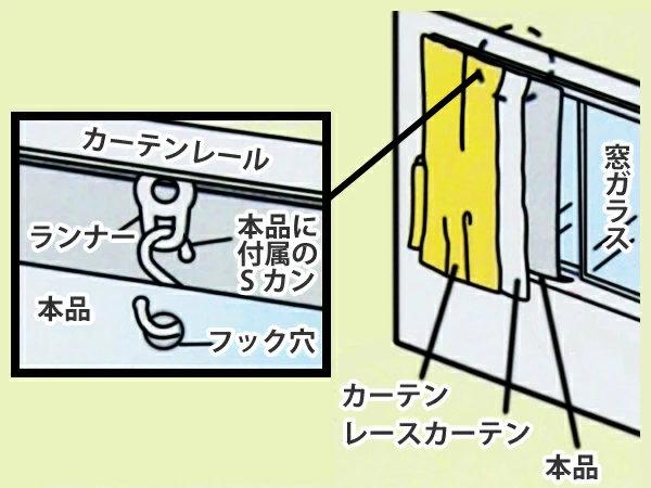 一番窓側にあるご使用中のカーテンを1枚外して本品を取り付けていただくか、そのままカーテンを使用される場合は、一番窓側にあるカーテンの窓側からランナー部分に本品付属のSカンを引っ掛けて重ねてご使用ください。