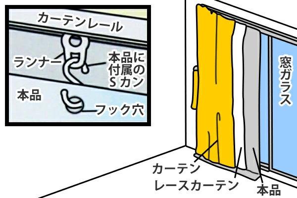 一番窓側にあるご使用中のカーテンを1枚外して本品を取り付けていただくか、そのままカーテンを使用される場合は、一番窓側にあるカーテンの窓側からランナー部分に本品付属のSカンを引っ掛けて重ねてご使用ください。