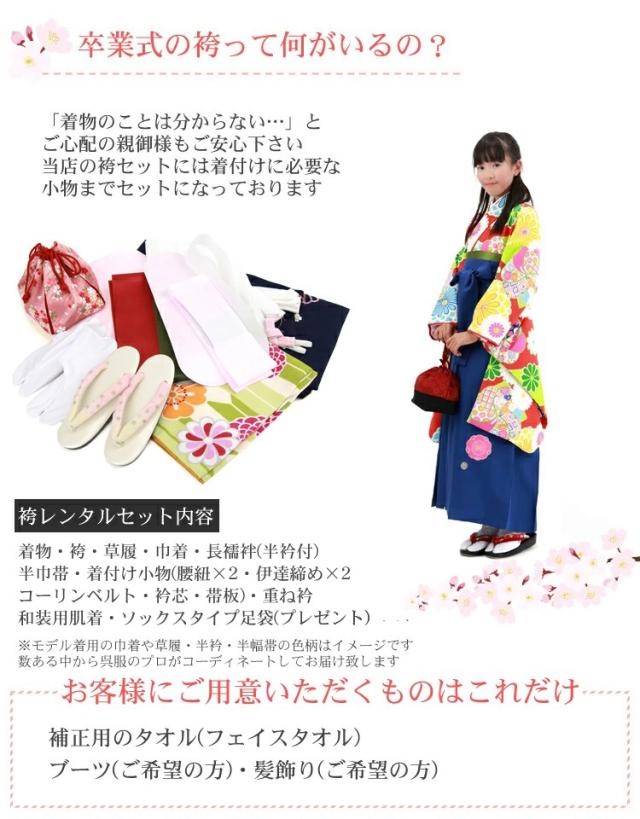 着物・袴・草履・巾着・長襦袢(半衿付)・半巾帯・着付け小物(腰紐2本・コーリンベルト・伊達締め2本・衿芯・帯板)・重ね衿・和装用肌着・ソックスタイプ足袋(プレゼント)