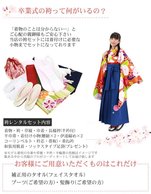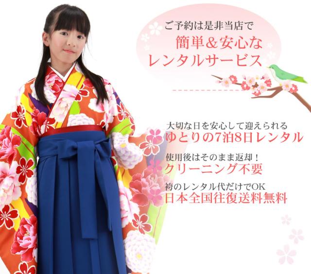 7泊8日レンタル袴のご使用日の5日前に到着一緒に同封されている伝票でご返送ください。当店でしかレンタルできない!オリジナルブランド[ブリリアントピース][セット内容]着物・袴・草履・巾着・長襦袢(半衿付)・半巾帯・着付け小物(腰紐2本・コーリンベルト・伊達締め2本・衿芯・帯板)・重ね衿・和装用肌着・ソックスタイプ足袋(プレゼント)【サイズ】[着物]身 丈 約 98.5cm袖 丈 約 75cm裄 丈 約 65cm[袴]袴の丈 84cm (対応身長145cm〜150cm前後)[素材]着物・袴・長襦袢:ポリエステル100%モデル身長…147.5cm(袴の丈84cm使用)※予約状況を確認してレンタル可か不可のメールをお送りします※モデル着用の巾着や草履・半衿・半幅帯の色柄はイメージです。 ※予約状況を確認してレンタル可か不可のメールをお送りします※着物の柄の配置は写真とまったく同じではございません。※モデル着用の巾着・半巾帯・重ね衿・草履など小物の色、デザインはイメージです。数ある中から呉服のプロがコーディネートしてお届け致します。