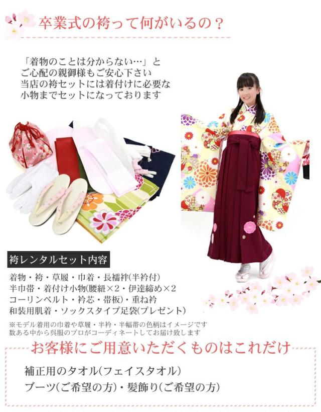 着物/袴/草履/巾着/長襦袢(半衿付)/半巾帯/着付け小物(腰紐2本/コーリンベルト/伊達締め2本/衿芯/帯板)/重ね衿/和装用肌着/ソックスタイプ足袋(プレゼント)