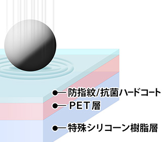 「特殊シリコーン樹脂層」がしっかりと衝撃を吸収し、機器へのダメージをやわらげるので、液晶画面をキズや衝撃から守ることができます。