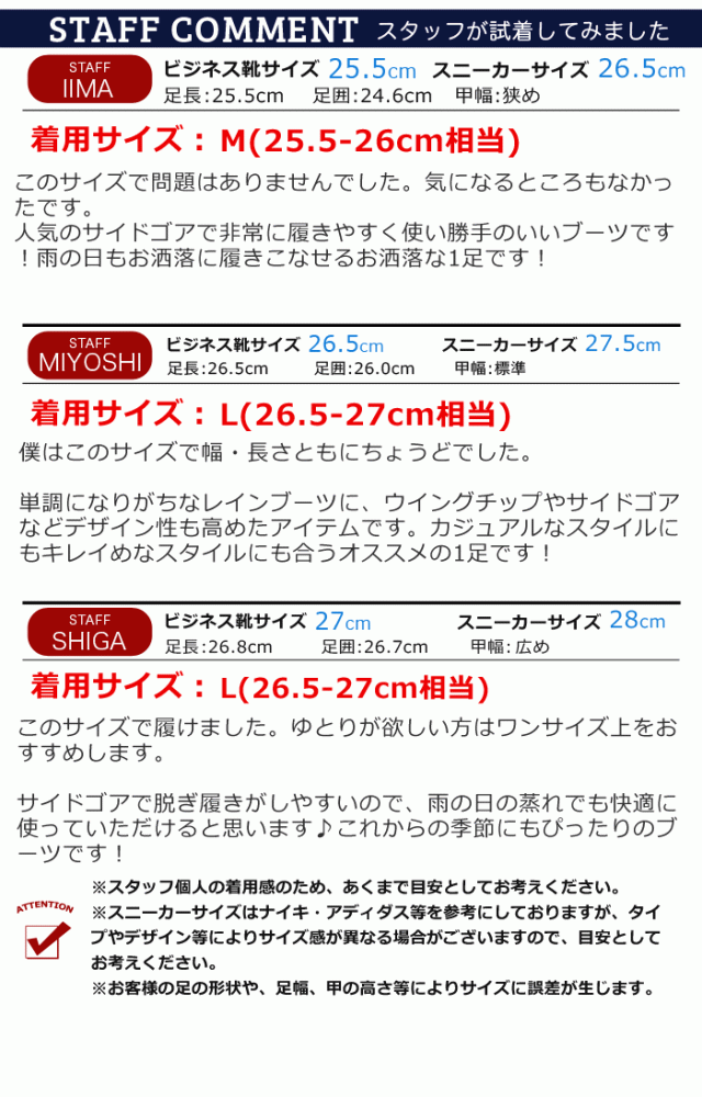 - Mサイズを購入しました。いつもは、ビジネスシューズは、25.5で少し大きい感じですが、ブカブカした感じの歩き辛さはありませんでした。メンズのレインシューズなかなか店舗では見かけないのてで購入してよかっ...