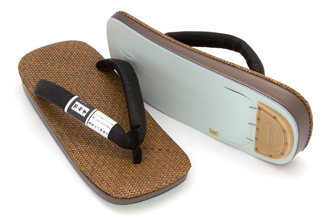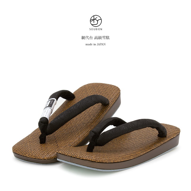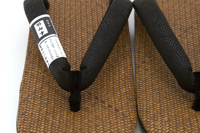 手の込んだ網代編みの台に、本印伝の鼻緒が挿げられています。
