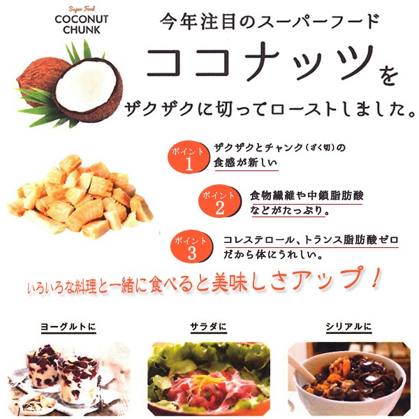 「ココナッツチャンク」は、スーパーフードココナッツをぶつ切り(チャンク)にしローストしました。食感が新しく、食物繊維や中鎖脂肪酸などがたっぷり入っています。また、カラダに嬉しい、コレステロール、トランス脂肪酸ゼロです。お召し上がり方は、ヨーグルトやサラダにトッピングしてお召し上がり下さい。