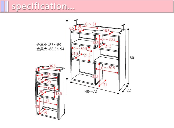 | 本体サイズ | [外寸]幅40.0〜72.0×奥行22.0×高さ80cm (金具小使用時)高さ83〜89cm (金具大使用時)高さ88.5〜94.0cm [内寸] (上オープン部左)幅0〜31×奥行20.0×高さ6.5cm (上オープン部右)幅36.5×奥行18.5×高さ5.0cm (2段目左)幅35.0×奥行20.0×高さ15cm (2段目右)幅0〜30.5×奥行21.5×高さ18.5cm (3段目左)幅0〜30.5×奥行21.5×高さ21.5cm (3段目右)幅35.0×奥行20.0×高さ18.5cm (4段目左)幅35.0×奥行19×高さ30cm (4段目右)幅0〜30.5×奥行21.0×高さ33.5cm |