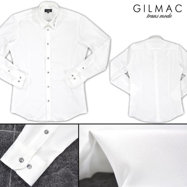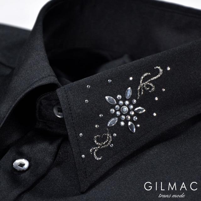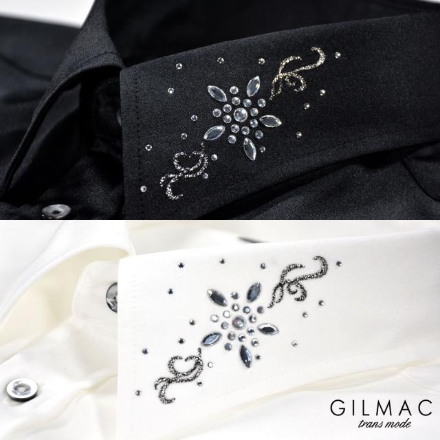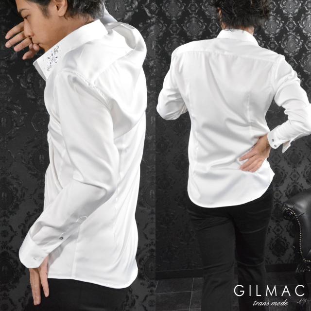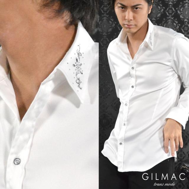 サテンシャツ 無地 日本製 レギュラーカラー メンズ 襟 花 ラインストーン 結婚式 ドレスシャツ(ホワイト白) 36740