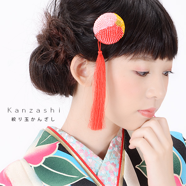 少し大きめの絞り玉に長めの房飾りはついた髪飾りです。卒業式、謝恩会の袴姿に、振袖にも可愛らしい雰囲気ですし、普段のお着物にもレトロモダンな雰囲気で合わせていただけます。ほかの髪飾りと組み合わせて使ってもいいですね。