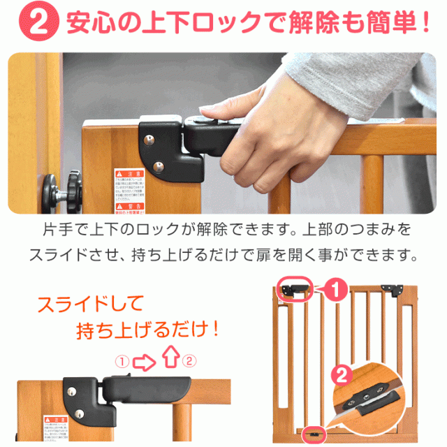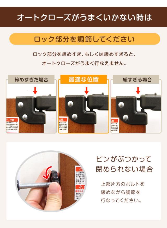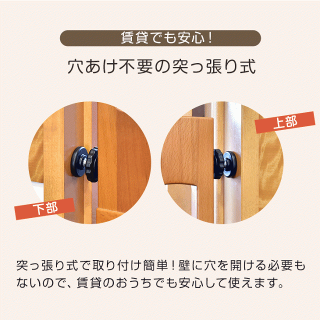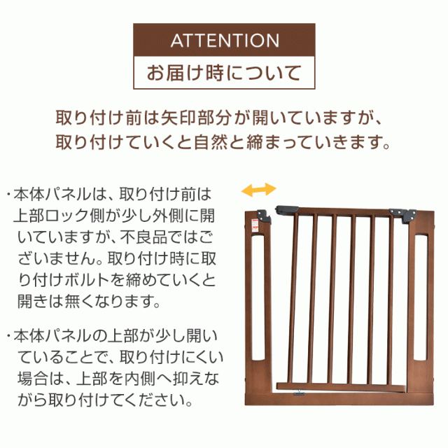 | 【中国製】 ※配送は全て宅配便(1人)での玄関渡しとなります。 ※本製品を使用しているときは、保護者の方はお子様の動作に十分注意を払ってください。 ※階段降り口に使用すると万が一の場合、階段から落ち怪我をする可能性があるため、階段降り口(階段上)でのご使用はできません。 ※ご使用前に必ず同封の取扱説明書をよくお読みの上、正しくお使いください。誤った使い方をすると、人的または物的損傷を負う可能性が御座います。 ※扉は半開きの状態で手を離すと、自動的に閉じ、上下のロックもかかりますが、安全のために実際に扉がロックされていることを必ず確認してください。 ※2024年9月より「ダークブラン」を「ブラウン」に変更し、色味の調整を行いました。 |
