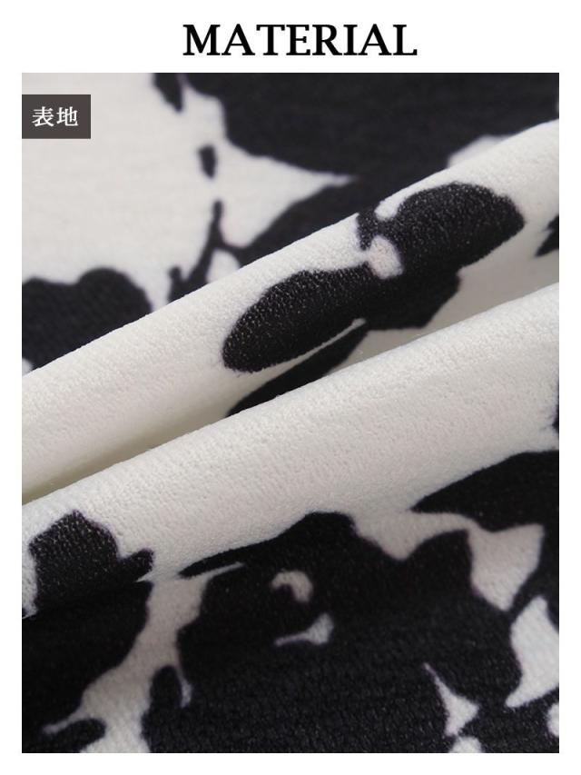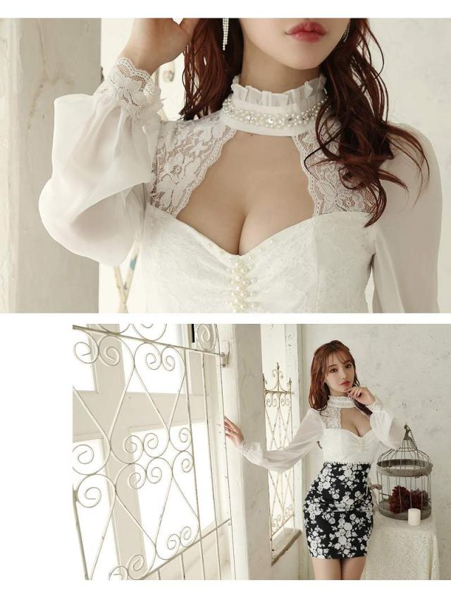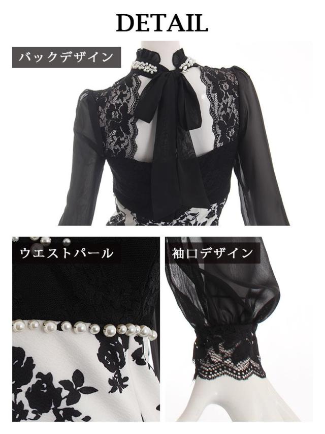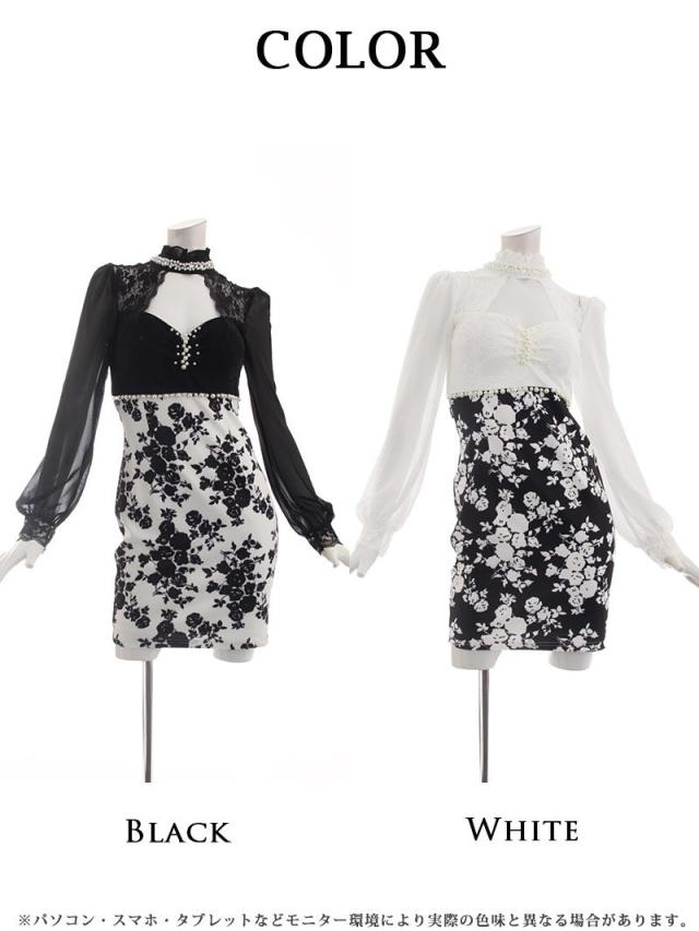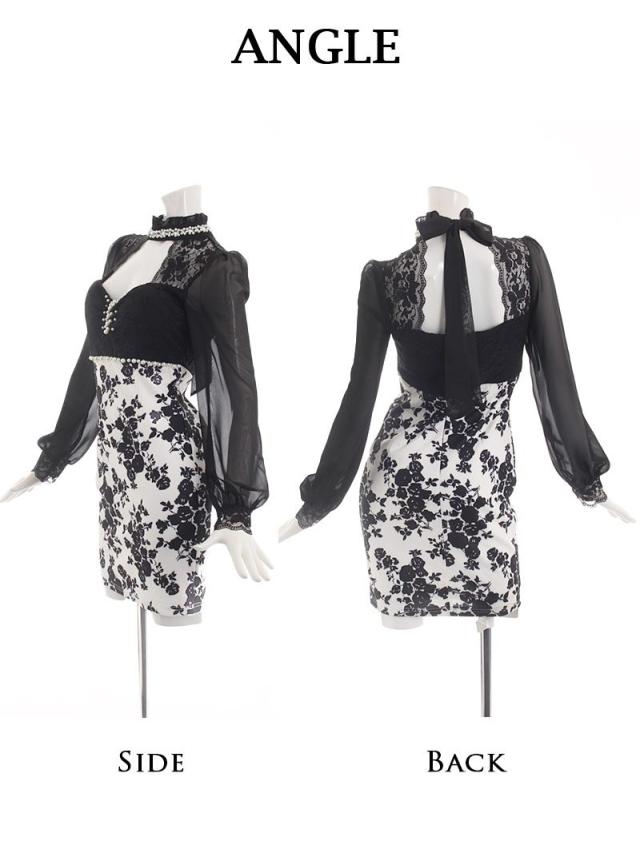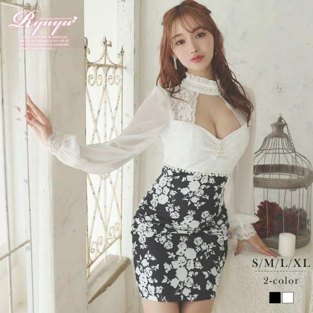 ミニドレス Ryuyu 長袖 袖有り 谷間魅せ 花柄 モノトーン キャバ ドレス キャバドレス ミニドレス ミニ キャバクラド