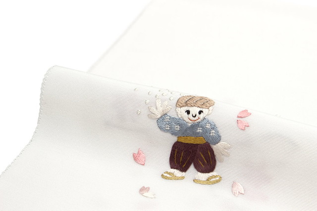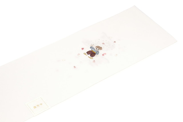 日本製の生地に、昔話の花咲爺が中国の伝統工芸品・蘇州刺繍で再現された遊び心いっぱいの柄ゆきです。
