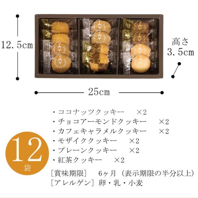 【商品名】 神戸トラッドクッキー 【内容】クッキー ココナッツ・チョコアーモンド・紅茶・モザイク・カフェキャラメル・プレーン ×各2 【賞味期限】常温6ヶ月 (表示期限の半分以上) 【アレルゲン】卵・乳・小麦卵・乳・小麦