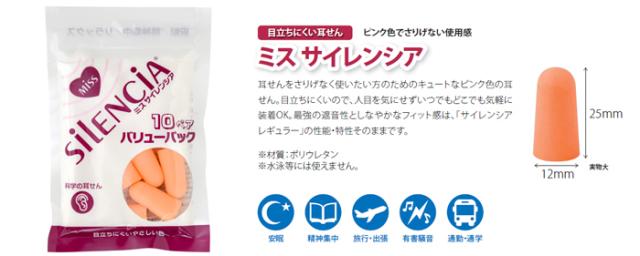 お得な10ペア 耳栓 ミスサイレンシア バリューパック ピンク 目立ちにくい 防音 32dB 女性向け 安眠 快眠 勉強 集中 テレワーク 在宅 旅行 トラベルグッズ メール便可