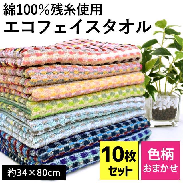 タオル フェイスタオル 10枚セット 約34×80cm 綿100% 残糸使用 エコタオル 残糸タオル エコ 訳あり フェイス 安い お得 ※色柄おまかせ