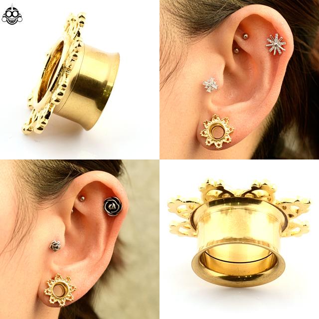 ボディピアス 2G 0G ゴールド フィリグリー インターナルダブルフレア トンネルピアス ロブ 拡張ピアス