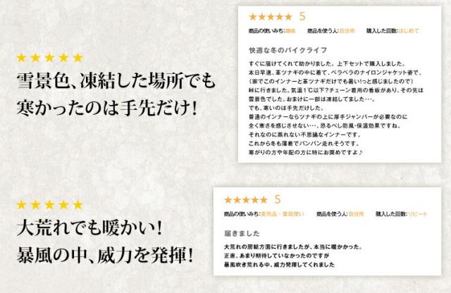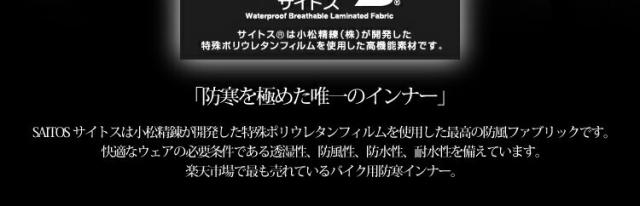 | サイトスインナーは高防寒性能、超低価格のハイスペックインナースーツです。 冬場の走行会、レース、ツーリングなどでレーシングスーツを活用される方にオススメです! 冬用レーシングインナーって高額ですよね?(市場価格¥15,000前後)超高機能素材を採用した低価格冬用ハイスペックインナースーツの登場です。冬場の走行会、冬場のレース活動、冬場のツーリングなど寒い季節のとっておきの商品です! 【商品内容】 1.サイトスレーシングインナー トップス ■商品の特徴■ 1.透湿性・・・汗の放出機能があってムレがない 2.防風性・・・衣服内への寒風の進入を防ぐ 3.防水性・・・外部からの雨・水の進入を防ぐ 4.耐水性・・・水に対する耐久性が高くヌレ感がない 5.レーシングスーツの脱着をスムーズにします。 6.機能素材を採用した低価格のレーシングインナーです。 ■ライディングを考慮した機能性■ ★襟の高さを高くし、襟元には風の進入を防止する前立てを装備。 ★袖口、裾口には肌にやさしい伸縮性をもったトリコット生地を使用。 ★立体裁断を採用し運動性を向上させました。 ★前傾に対応したストレッチ機能。 ★裏地にメッシュをボンディングし汗の放出と保温機能を両立。 ■What'sサイトスインナー■ SAITOS INNERサイトスインナーは世界の繊維メーカー、「小松精錬株式会社」、「セーレン株式会社」が開発した特殊ウレタン透湿性フィルムを使用した高機能素材です。快適なウェアの必要条件である透湿性、防風性、防水性、耐水性を備えています。 本製品の加工は小松精錬株式会社の"サイトス"かセーレン株式会社の"テクノブレン"のいずれかを採用しております。どちらかを選ぶことはできませんので予めご了承ください。※生産時期によって異なります。 ![]() |