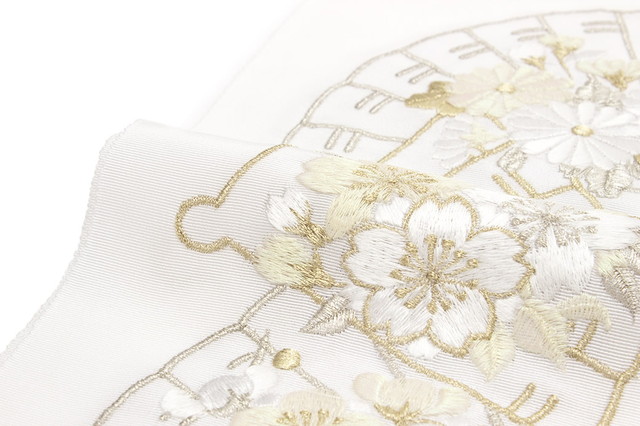 金糸銀糸を使い扇面に菊、桜、梅が大胆に刺繍されている上品な柄ゆきです。