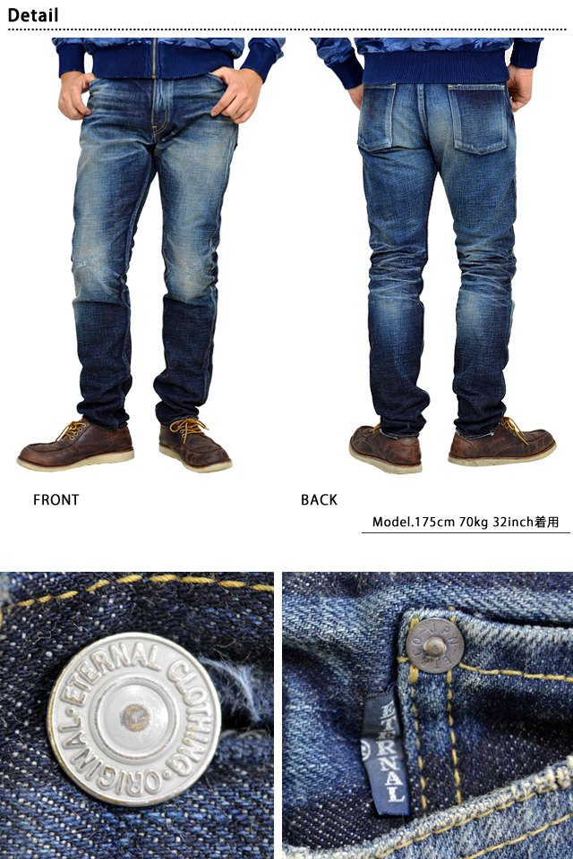 「長く愛され続ける服を作りたい」をコンセプトに、生地、縫製、加工に拘り続ける岡山発のジーンズ・デニムブランド 味わい深く着心地の良いウェアを追及し続けるブランド、ETERNAL。 シンプルなデニムにリメイクを施した、カジュアルなデニムパンツが登場。 すっきりとしたシルエットで、世代問わず穿いて頂くことの出来るシンプルなデザインが魅力的です。 トップボタンには、ブランドロゴが刻印されたオリジナルのものを採用。 革パッチやタグの端にある『三』は 素材、縫製、加工を表しています。 | |||||||||||||||||||||||||
