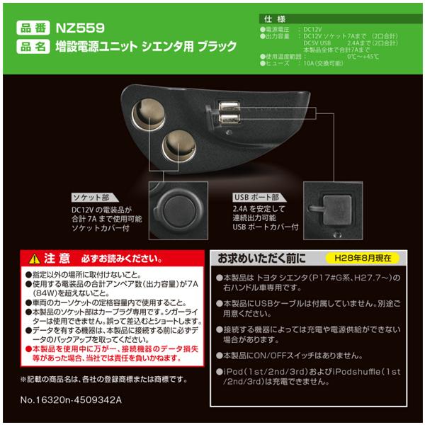 カーメイト:170/175系 シエンタ 専用 増設電源ユニット カーソケット×2口 7A USB×2ポート 2.4A/NZ559