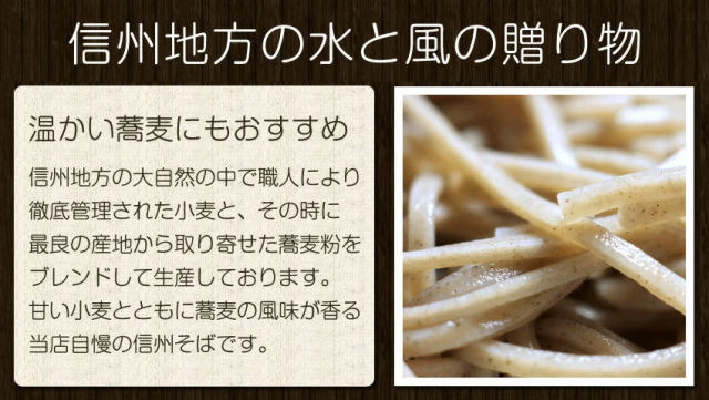 「信州そば」は、厳選されたそば粉とつなぎ粉を使用し、信州そば本来の風味と味わいにこだわったそばです。ぜひ、この風味と味わいをご賞味ください。